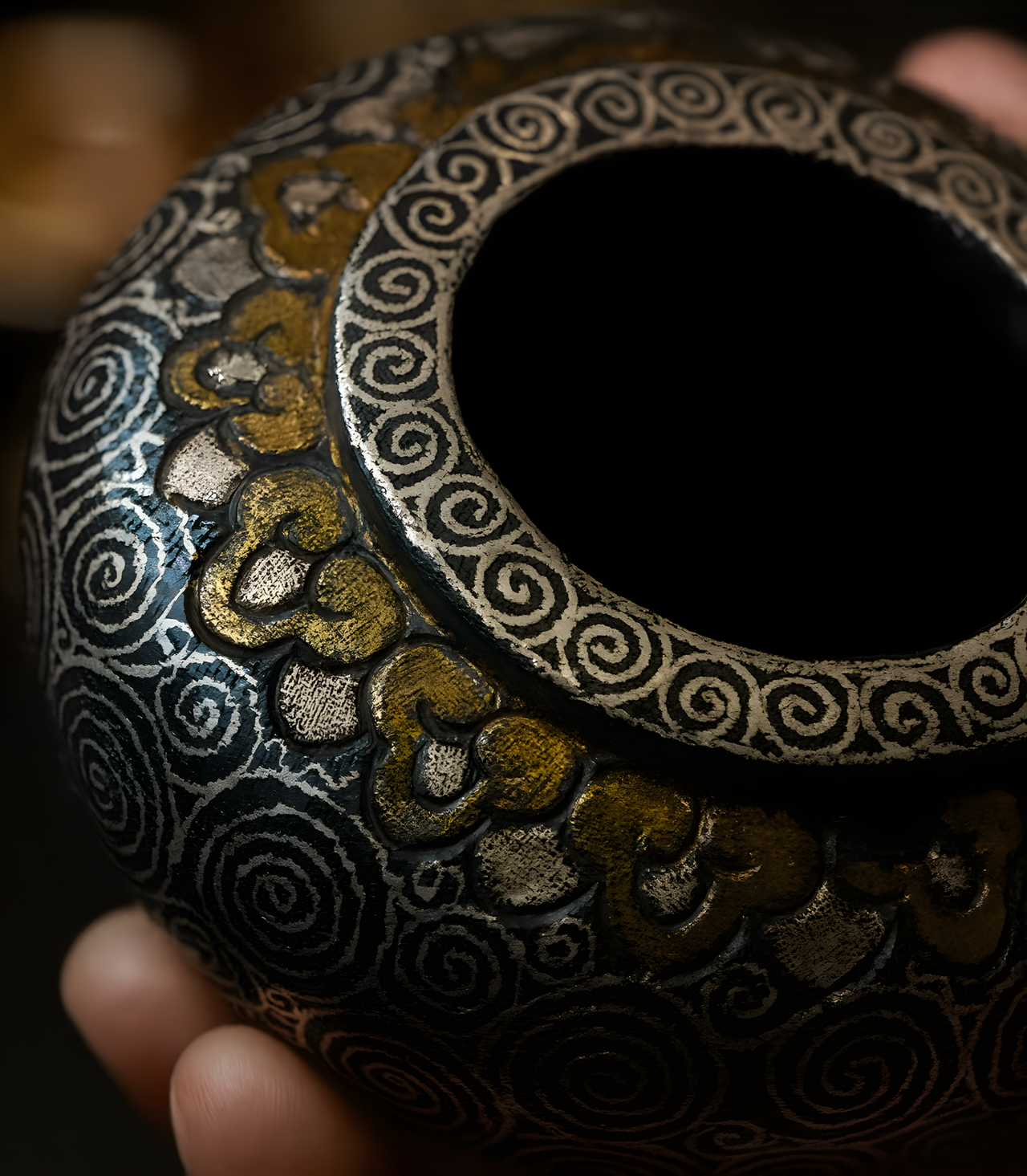 Within Tibetan culture, iron’s steadiness and gold’s radiance symbolize the balance of “emptiness and form, strength and softness.” Common motifs—cloud scrolls, meanders, endless knots, and vajra emblems—carry meanings of protection, connection, and awakening. Under sunlight or the glow of a butter lamp, the gently undulating gold catches a warm, living sheen, like highland wind brushing the eaves of the Potala—quietly smoothing the mind. Set on a meditation ledge, tea table, or writing desk, it becomes a tangible blessing: absorbing the outer noise, returning inner clarity, and anchoring the present.