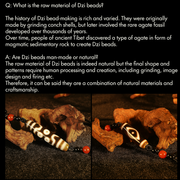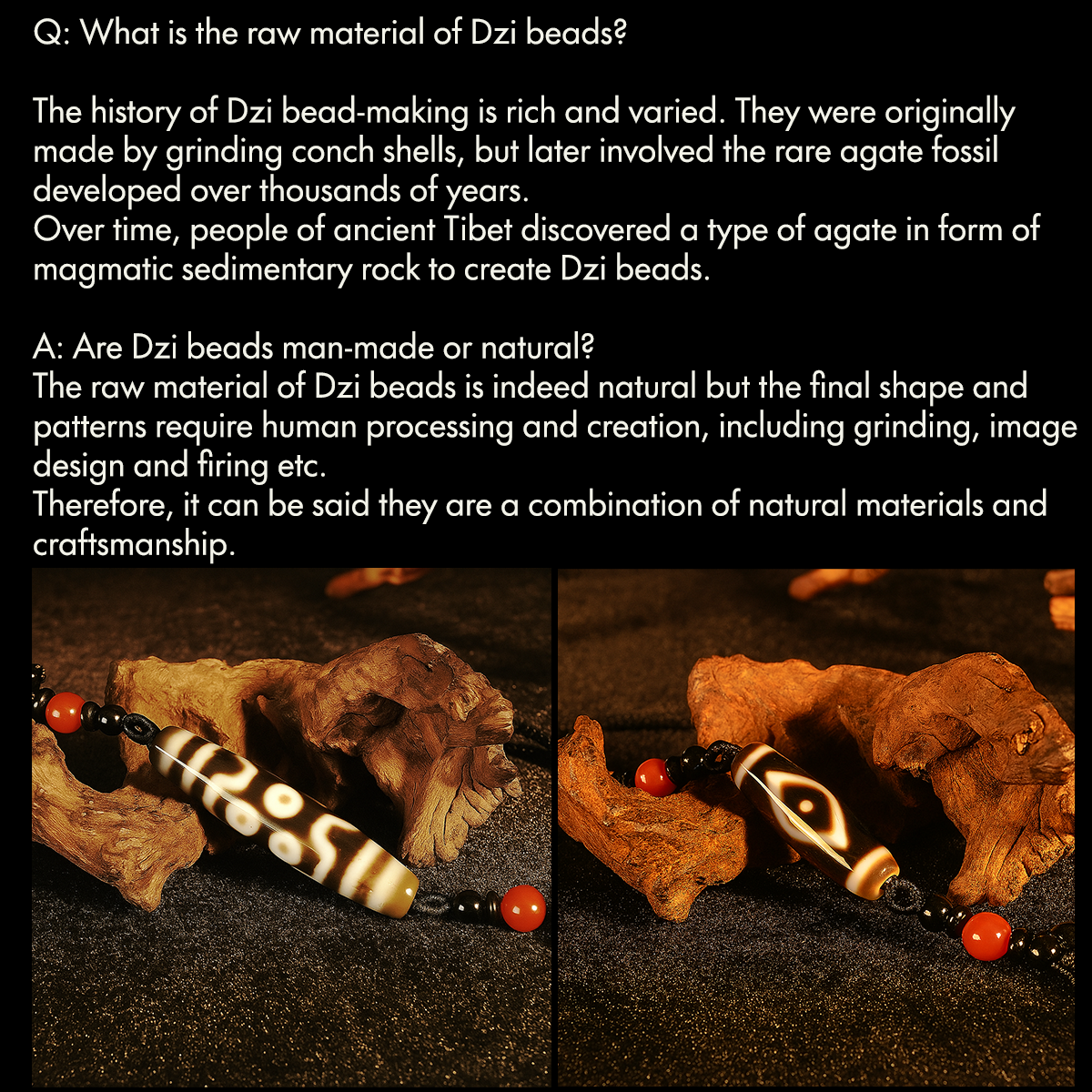 Agate is the most common and authentic material used for Dzi beads. After undergoing a special dyeing and heating process, agate reveals its unique patterns and vibrant colors. Known for its hardness and high luster, agate can feature a wide range of color combinations—such as black, white, red, and yellow.