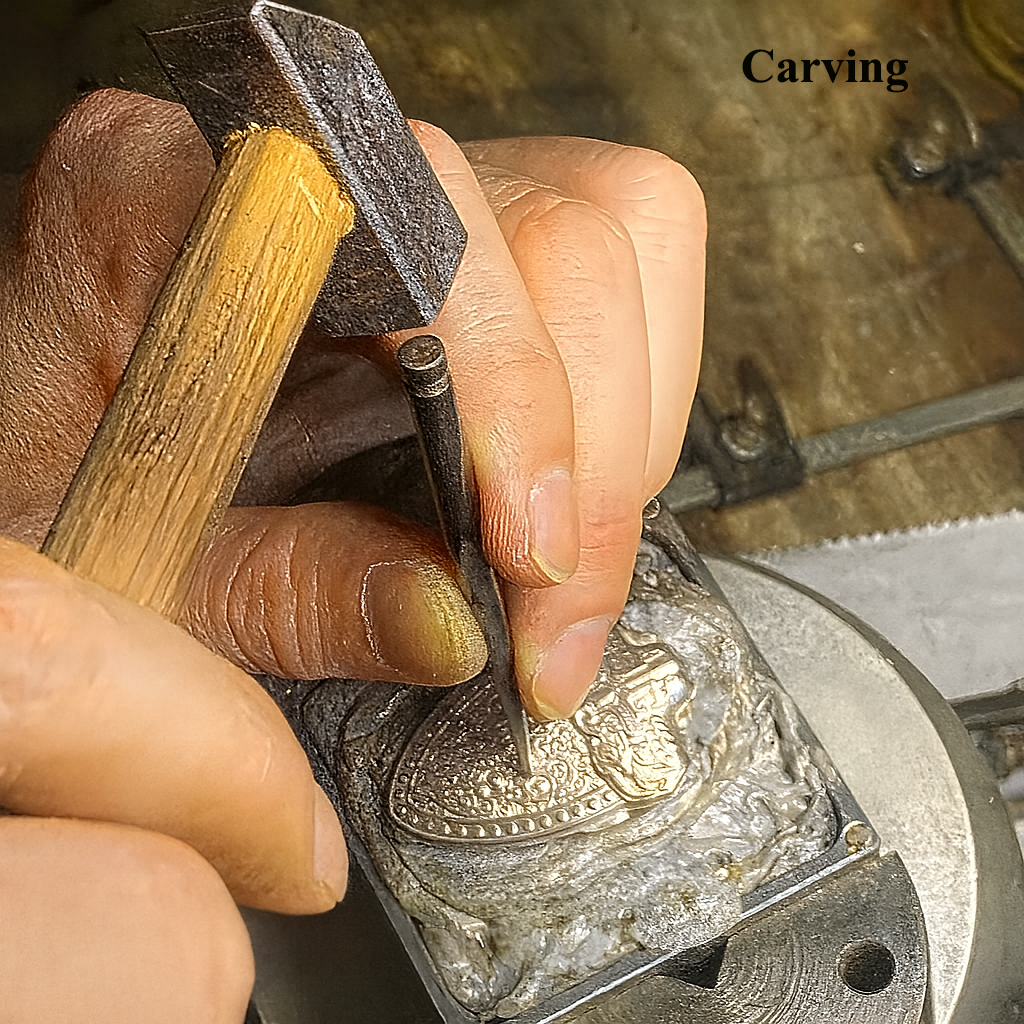 Every line, fold, and ornament is carved by hand. Under strong magnification, the details still hold up: no rough stamping, no flat printing, just layers of meticulous metalwork. It represents a pinnacle of hand metal artistry—heritage-level technique made wearable.
