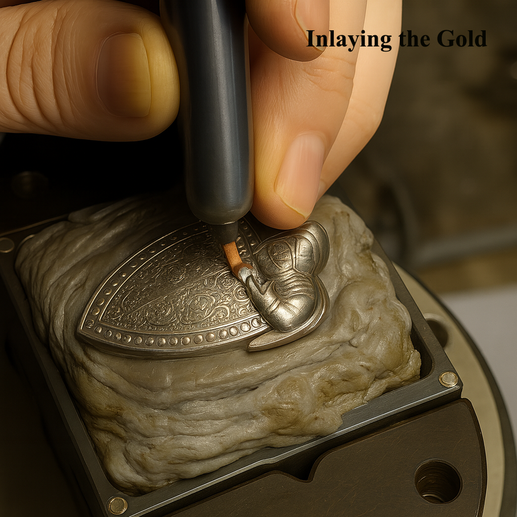 The inlaid gold is heated to near its melting point, then pressed firmly to bond securely with the metal base.