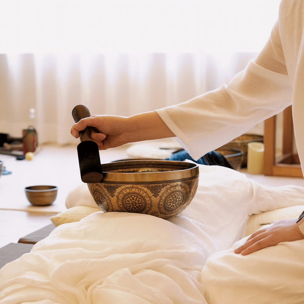 When the rim is gently played with a wooden mallet, the copper bowl produces rich, layered overtones that linger in the air and resonate through the body. This is more than music—it’s a physical vibration that synchronizes brainwaves, slows the breath, and naturally guides you into a meditative state.