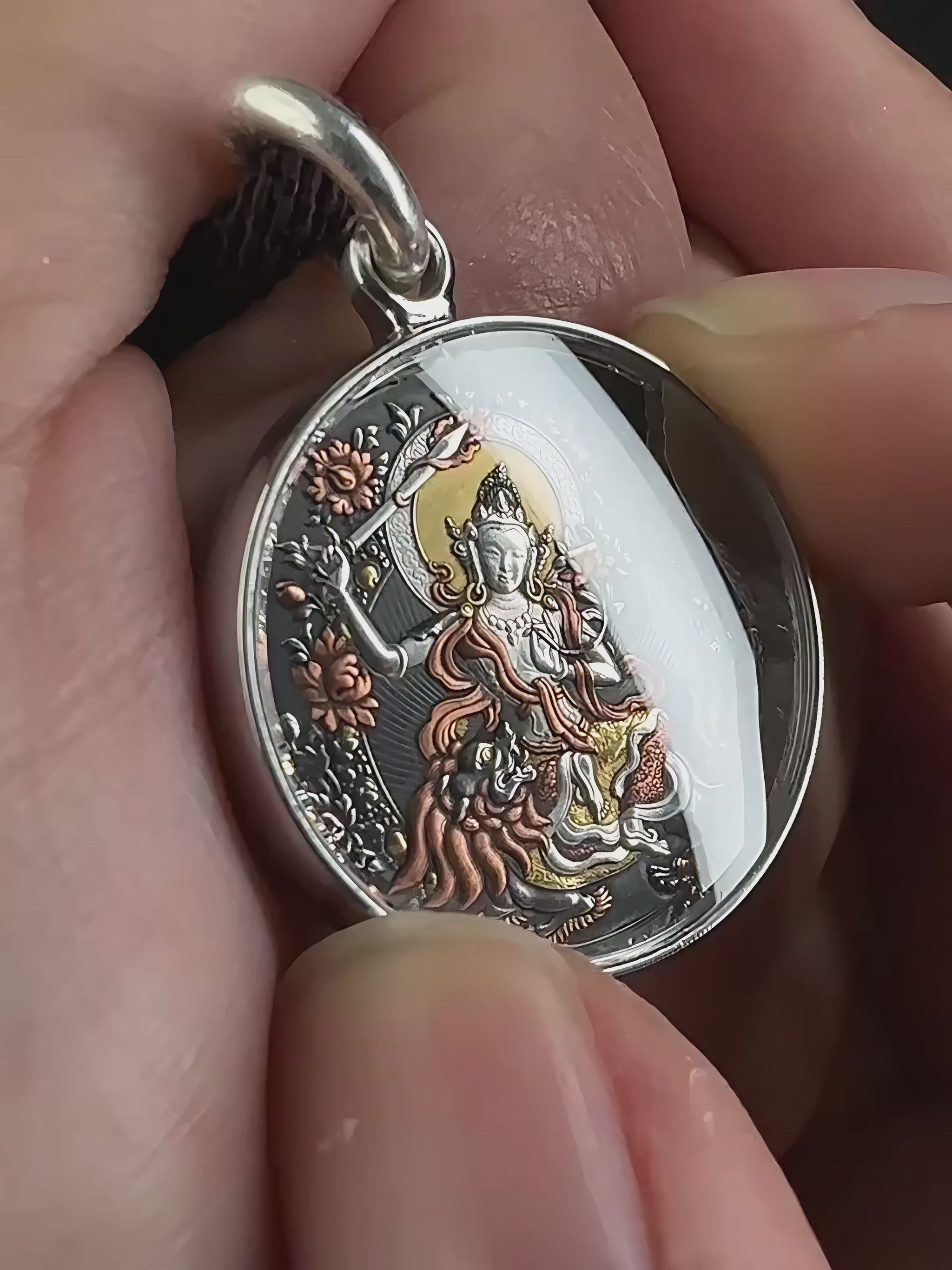The pendant is sealed with synthetic sapphire crystal mirrors on both sides. Sapphire crystal is used in high-end watches for a reason: high transparency, high hardness, excellent scratch resistance, and strong corrosion resistance. It keeps the thangka image crisp while protecting the craftsmanship like a glass vault.